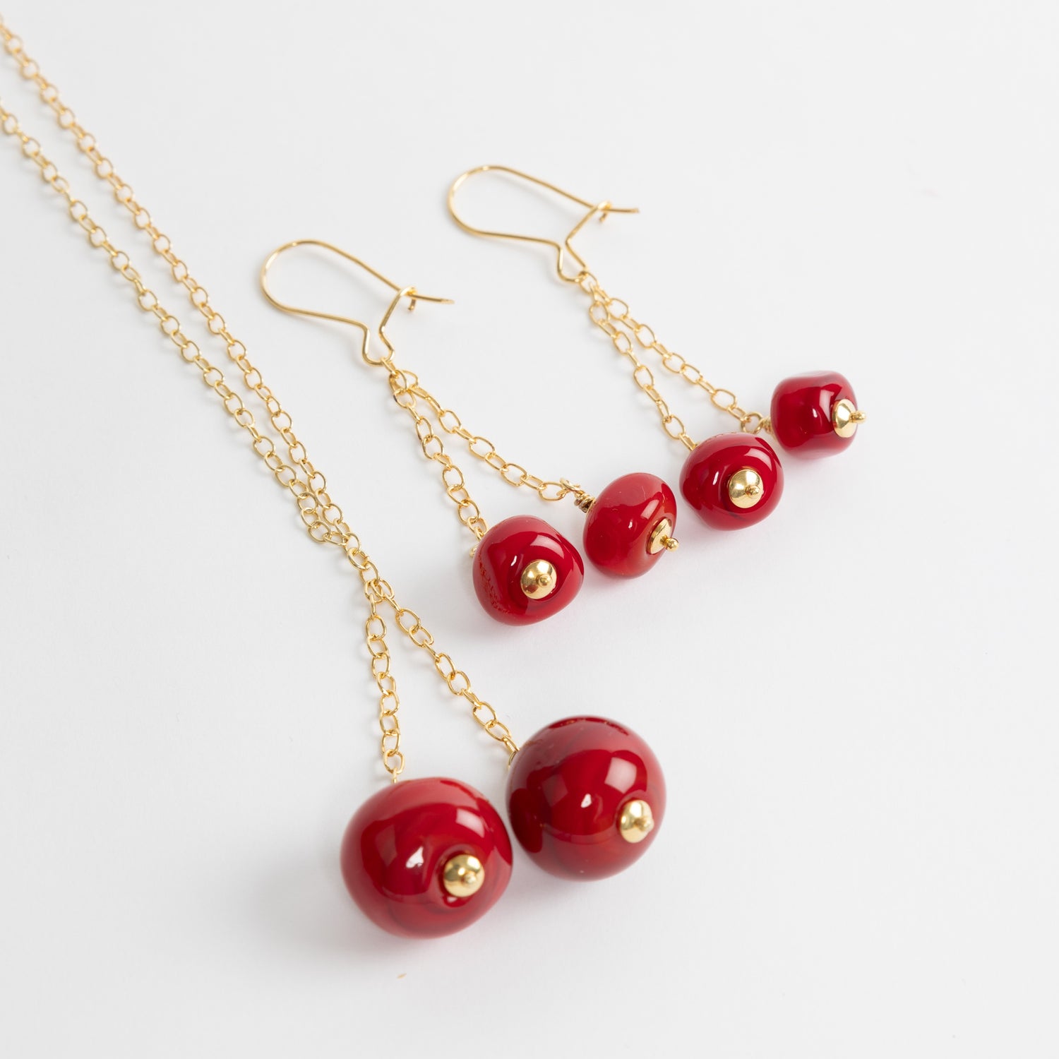 Goldplated jewelry with handmade glassbeads. Each bead is individually crafted using the traditional lampworking technique, where molten glass is shaped in a torch flame, making every piece truly one-of-a-kind.