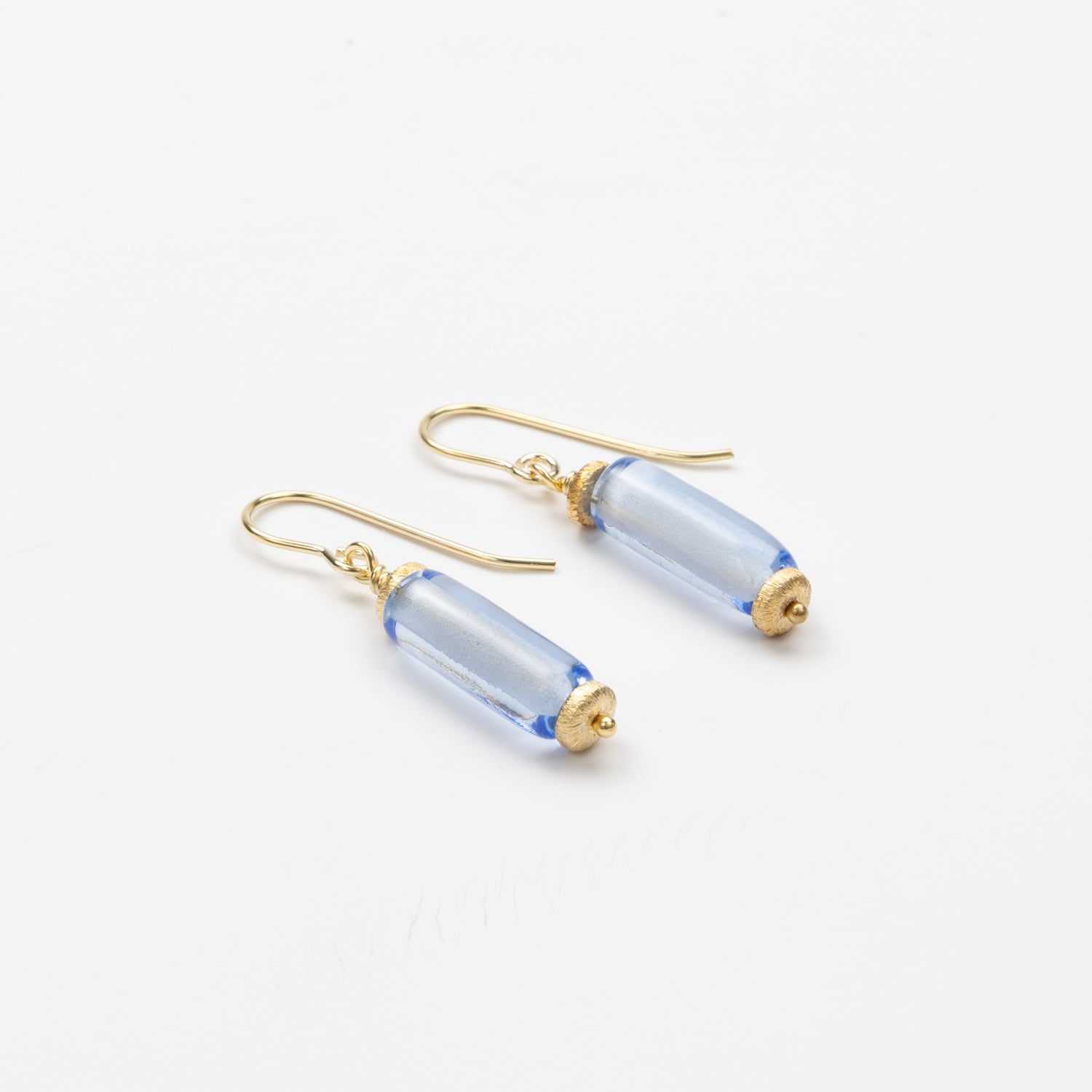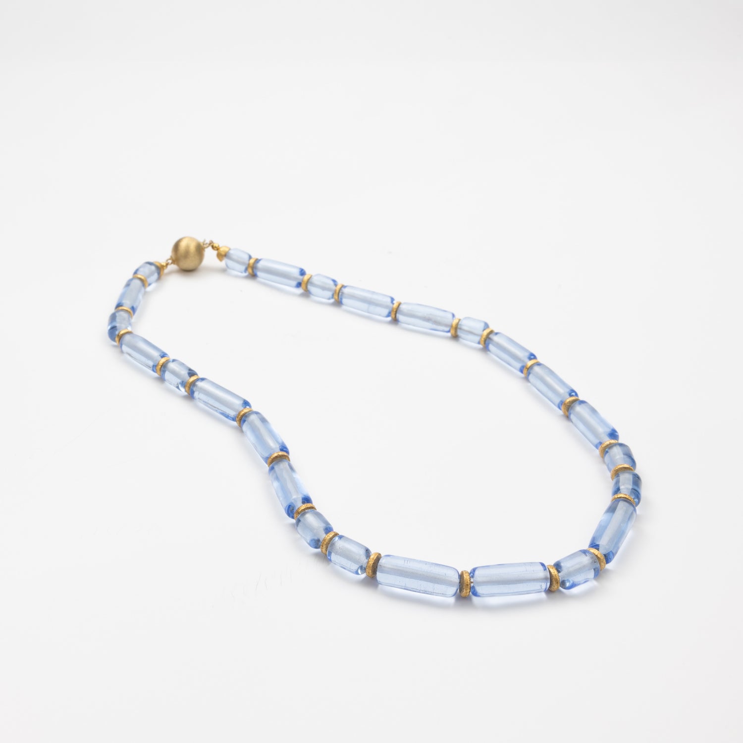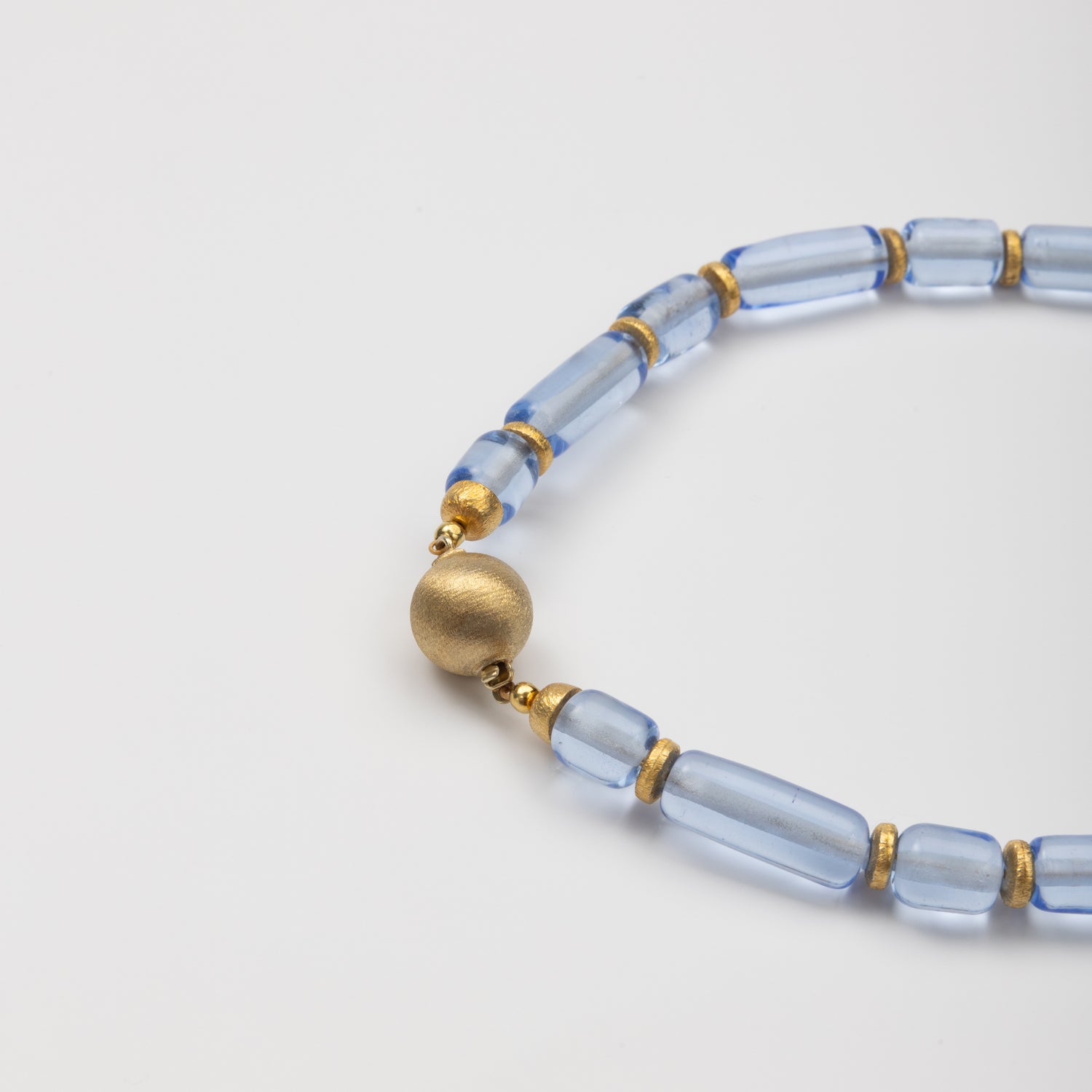 Each light blue glass bead is individually handcrafted using the traditional lampworking technique, where molten glass is shaped in a torch flame. Delicate gold-plated accents complement the cool tones of the glass. The result is a jewelry set that’s effortlessly elegant — and entirely one of a kind.