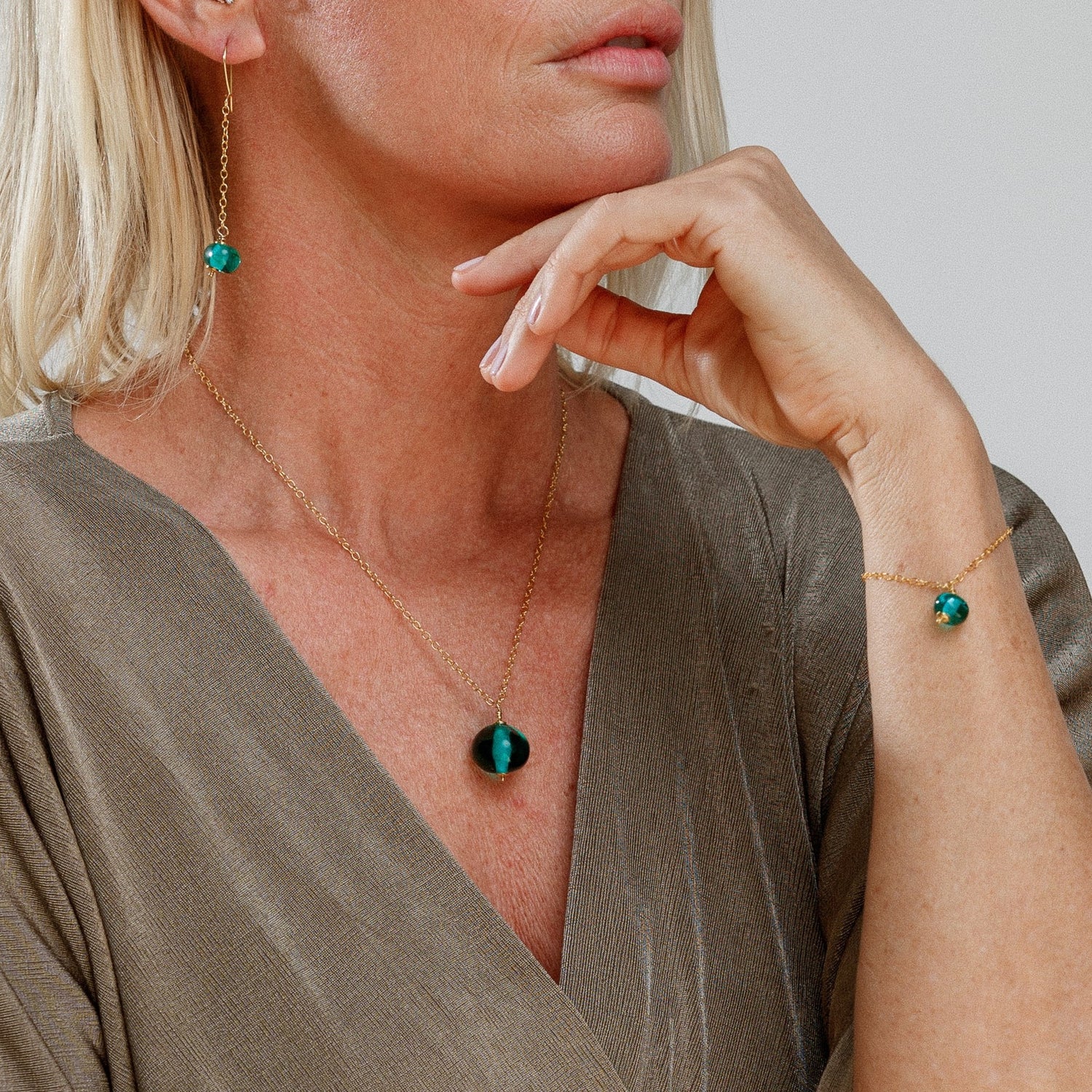 Add a touch of artistry to your everyday look with this stunning goldplated jewelry with handmade glassbeads. Each bead is individually crafted using the traditional lampworking technique, where molten glass is shaped in a torch flame, making every piece truly one-of-a-kind.